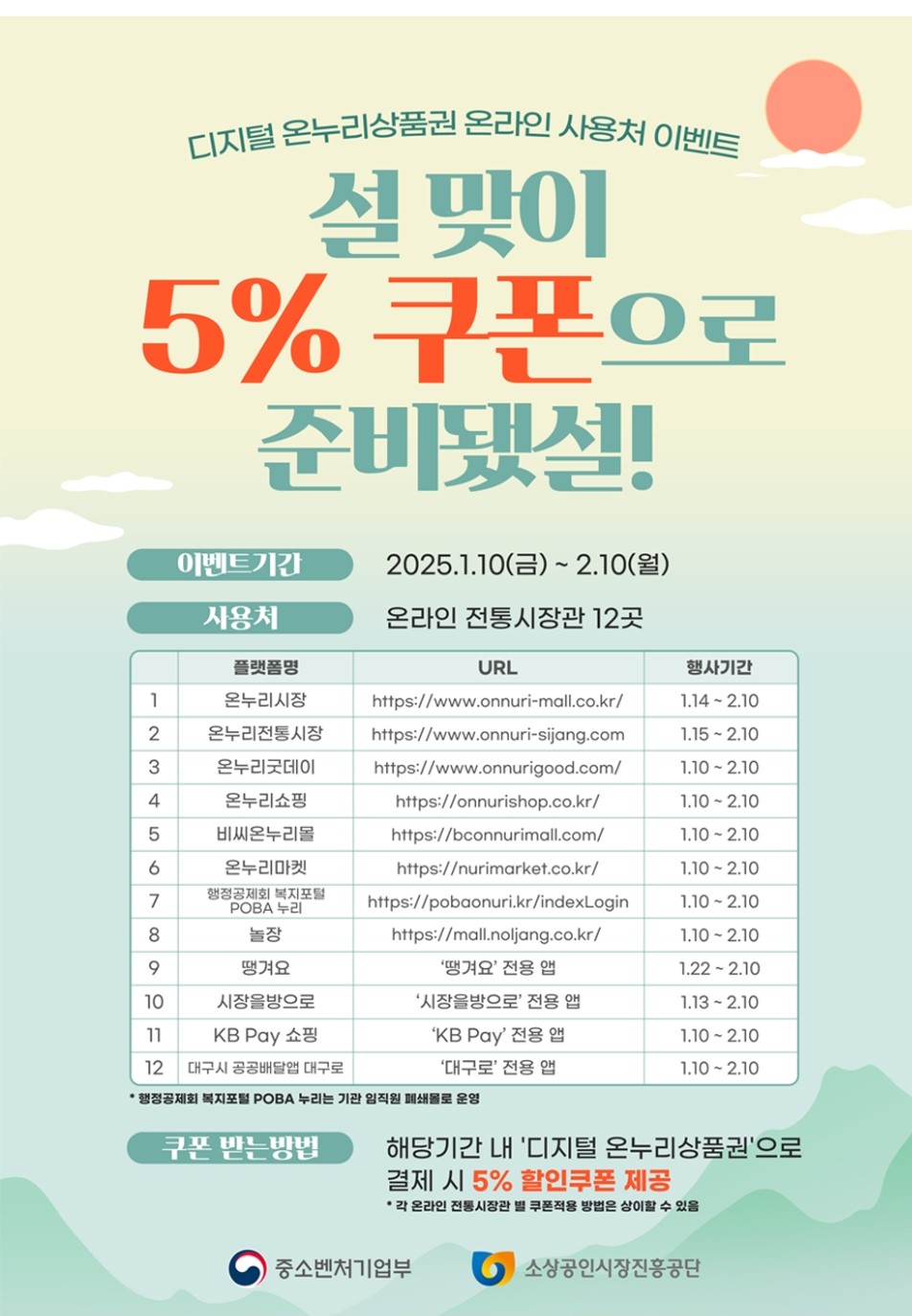 - 온라인 특별 할인: 온라인 전통시장관에서 5% 할인 쿠폰을 추가 적용하세요.